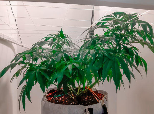 На 16-й день приступил к тренировке растения. Для фиксации использовал две резинки — слегка согнул центральный стебель. Спустя пару дней передвинул зажимы с резинками ближе к краю гроубэга, тем самым еще сильнее пригнув растение. Нижние листья аккуратно заправил, лампу поднял повыше, снизив PPFD до 256. После этого дополнительно натянул одну из резинок, закрепив за ручку горшка, и сделал более выраженный наклон. Также провел первую легкую дефолиацию: убрал пару нижних листьев и один из второй пары. Одну резинку сложил вдвое, чтобы пригнуть центр пониже, а листья спрятал под боковые побеги. Подсыпал еще немного субстрата. На фото хорошо видно, что к 21-му дню Гуля сформировала красивую структуру.